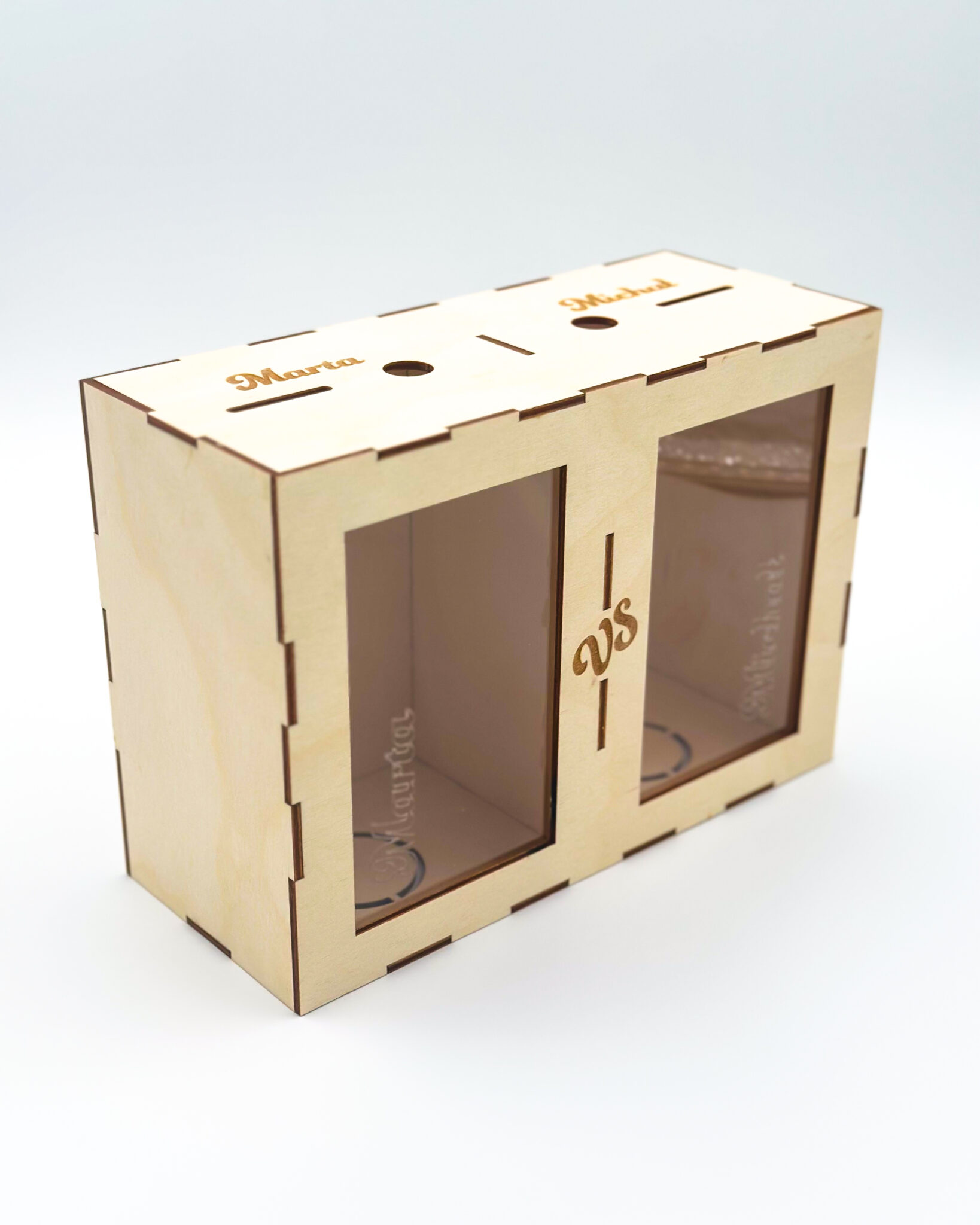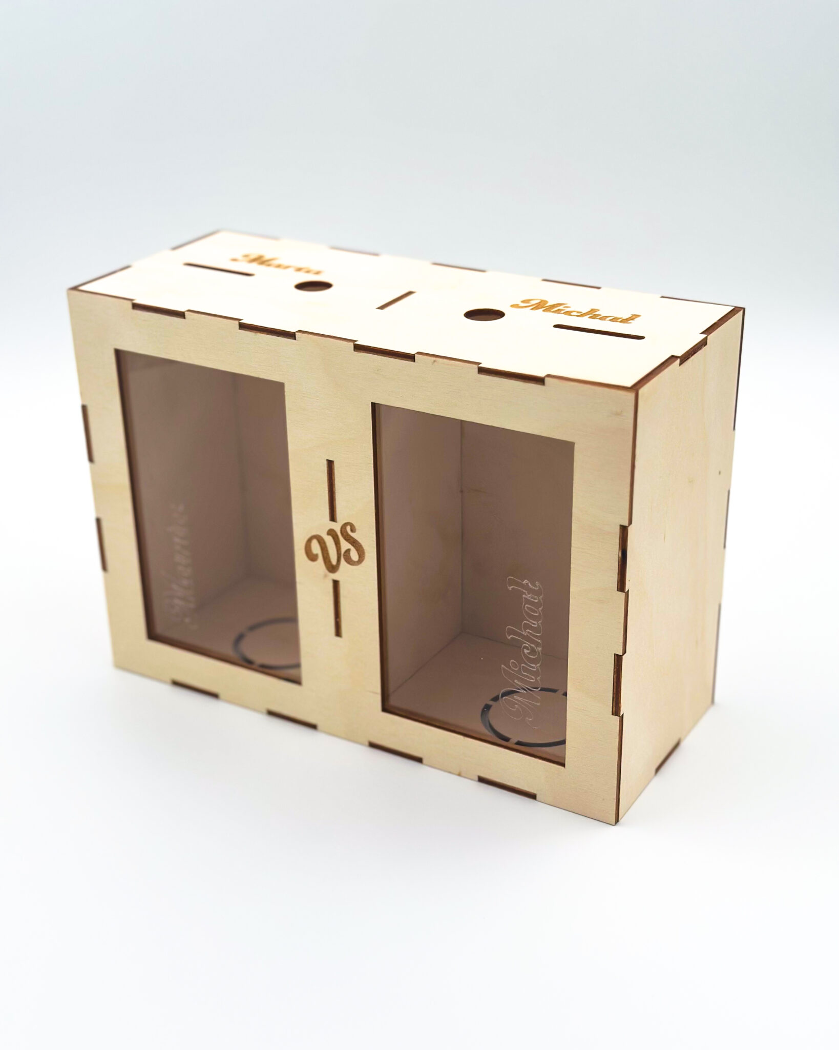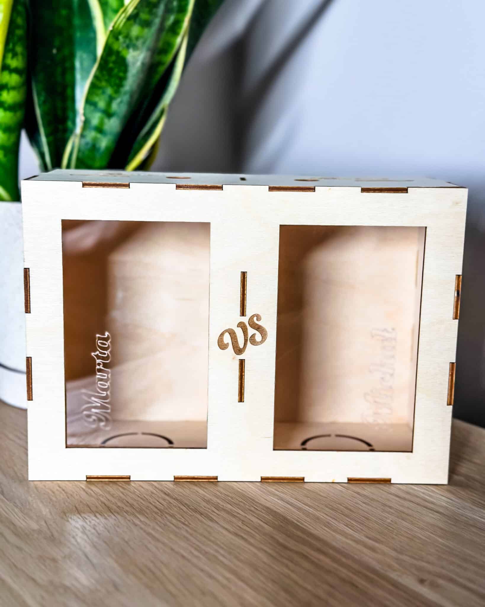 Personalised “X vs Y” money box with two saving sides, engraved with names and a custom message – a playful way to save and compete.