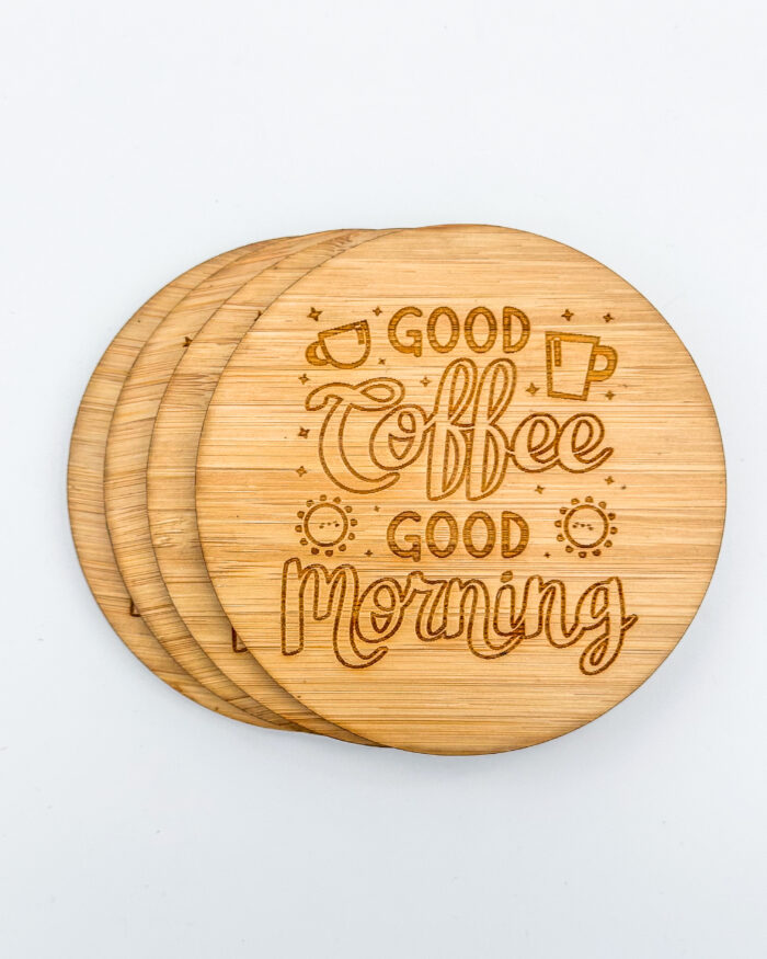 Set of 4 bamboo “Good Coffee Good Morning” coasters with cork backs, engraved with “. A cheerful start to any day for coffee lovers.