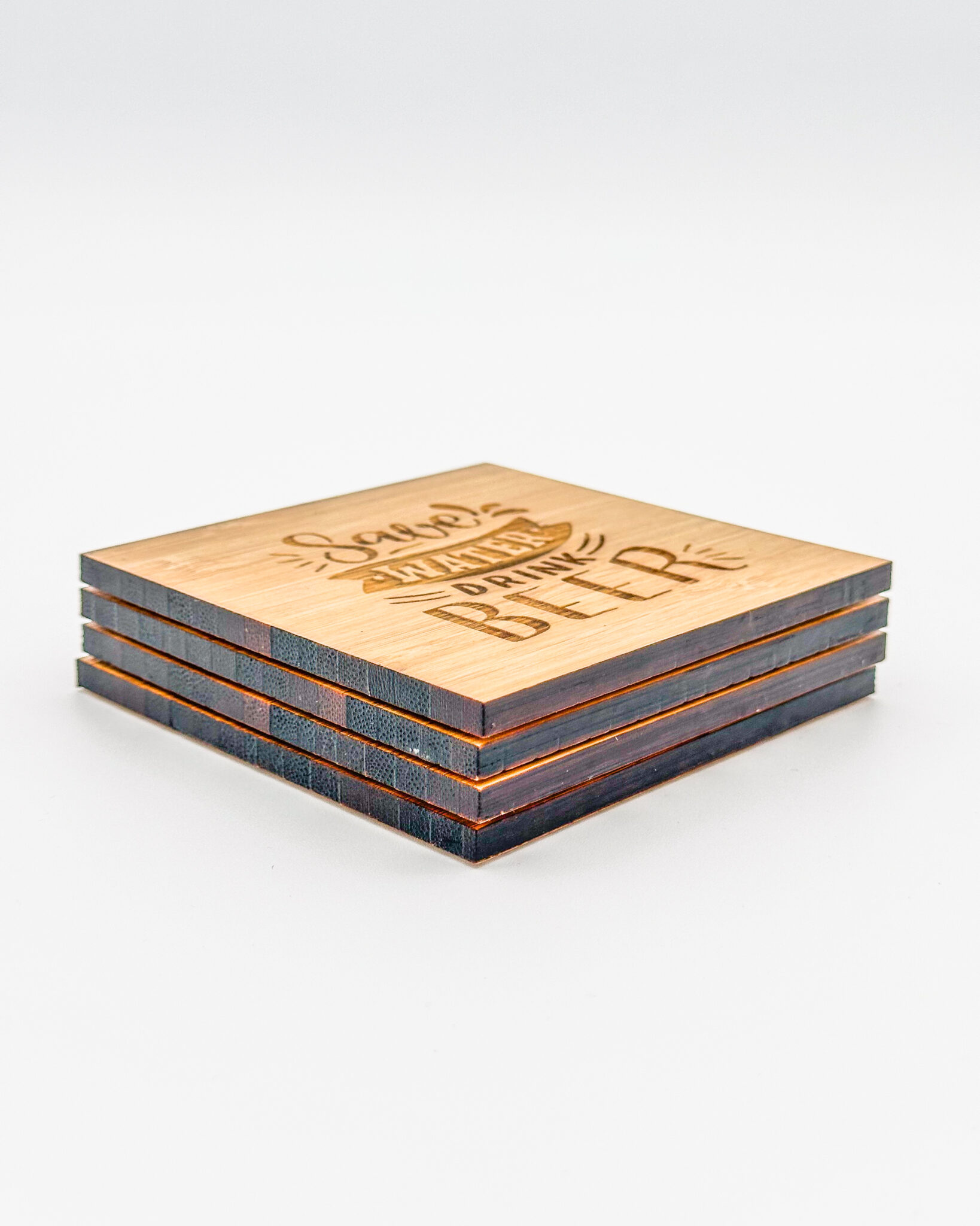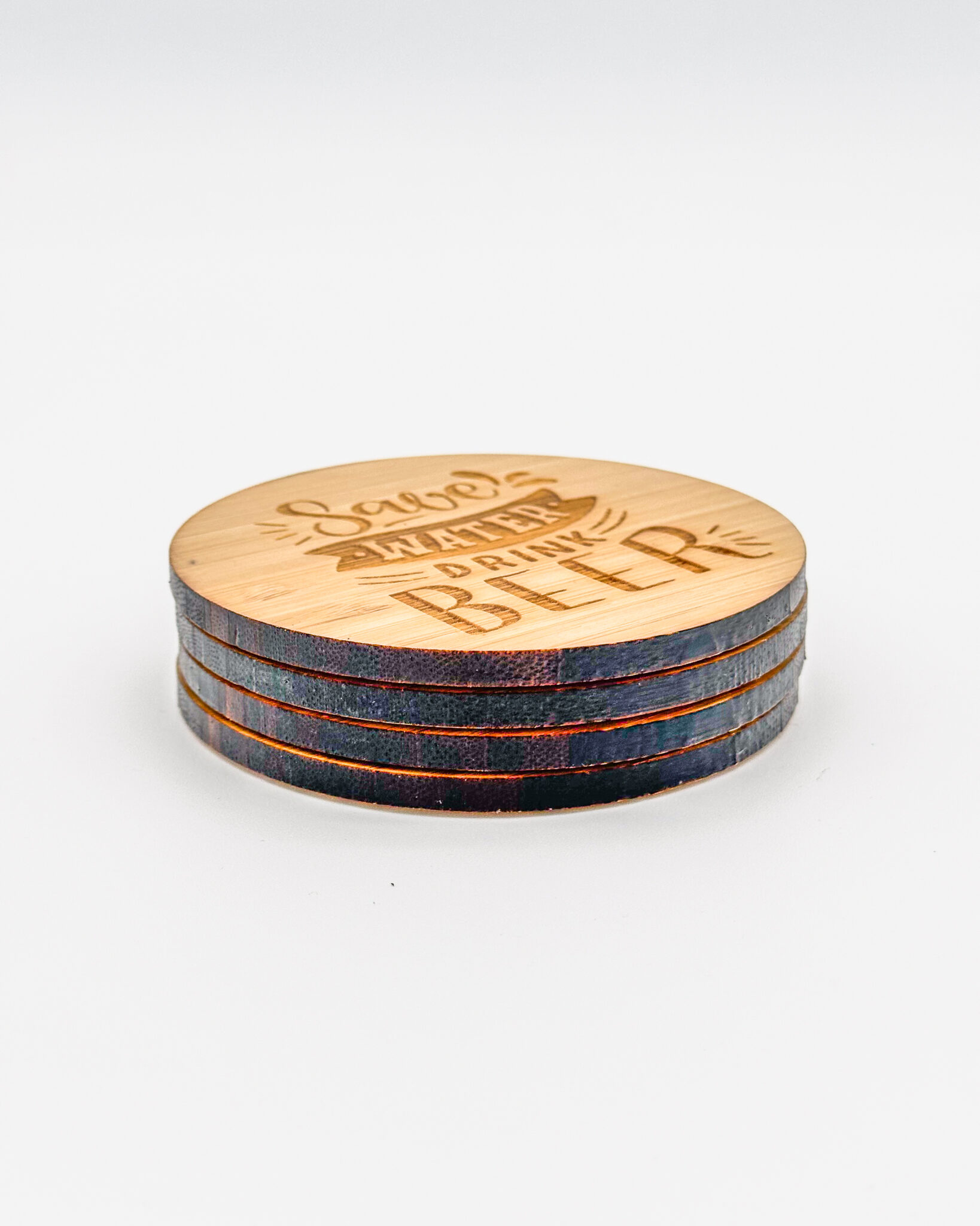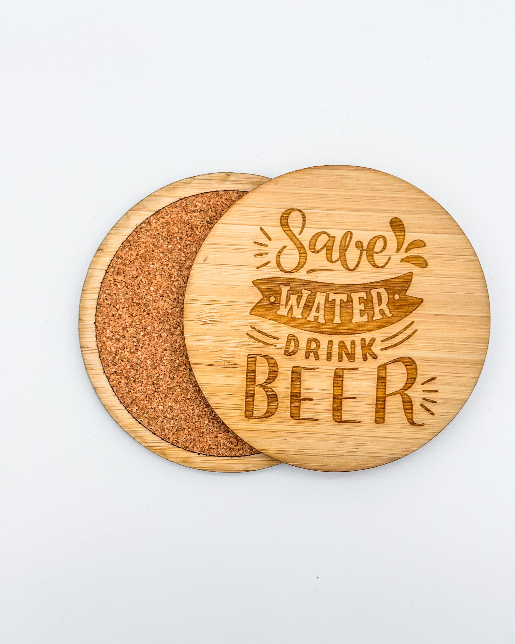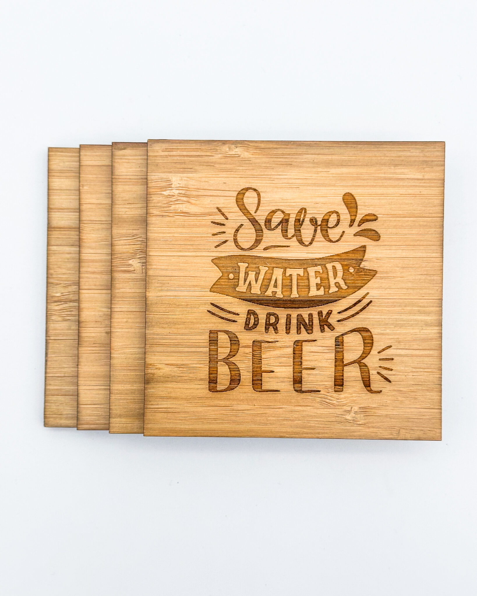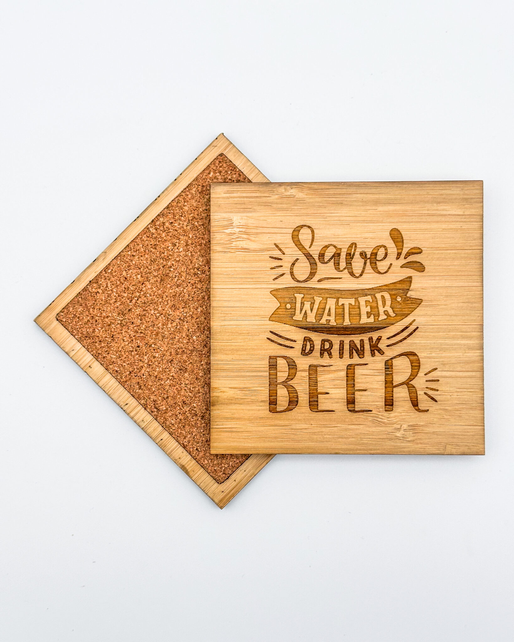 Set of 4 bamboo “Save Water Drink Beer” coasters with cork backs, engraved with “. A fun bar-themed coaster set for beer lovers and home pubs.