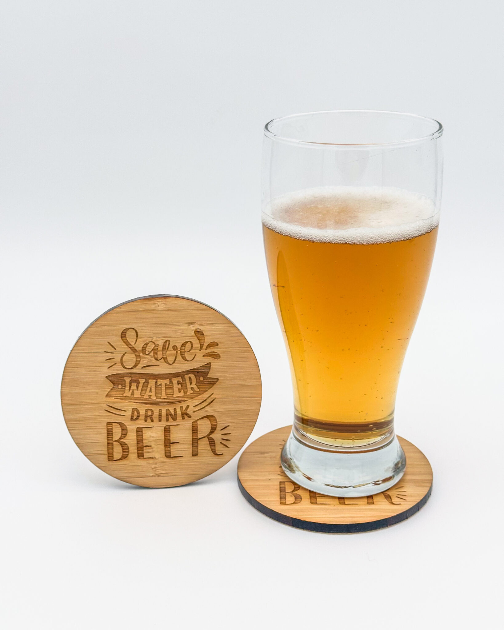 - Bamboo top with engraved “Save Water Drink Beer” design